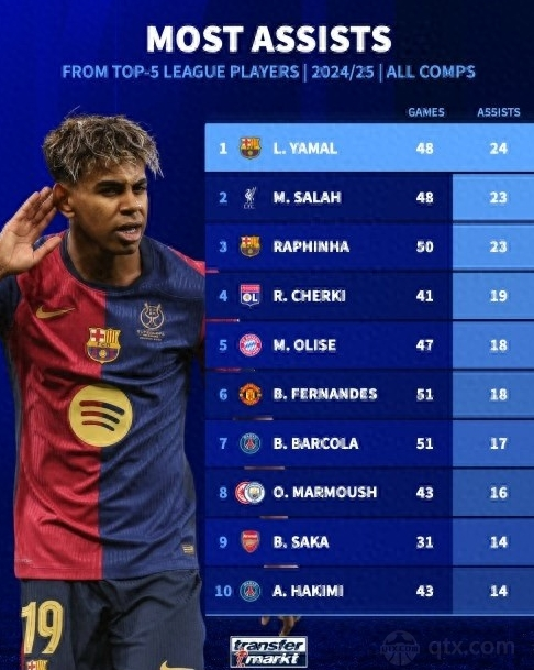 球天下4月29日讯 五大联赛目前已经进入最后阶段,多个联赛的冠军竞争已经结束,有的联赛还在进行争冠,德国足球转会网在近期统计了本赛季五大联赛球员的助攻次数榜单,在这份榜单中效力于巴塞罗那的西班牙前锋亚马尔排名榜首的位置,这名年轻前锋的助攻次数最多,效力于利物浦的埃及前锋萨拉赫以及效力于巴塞罗那的巴西前锋拉菲尼亚排名第二以及第三名的位置。另外,榜单中还有奥利塞、B费等球员在列。